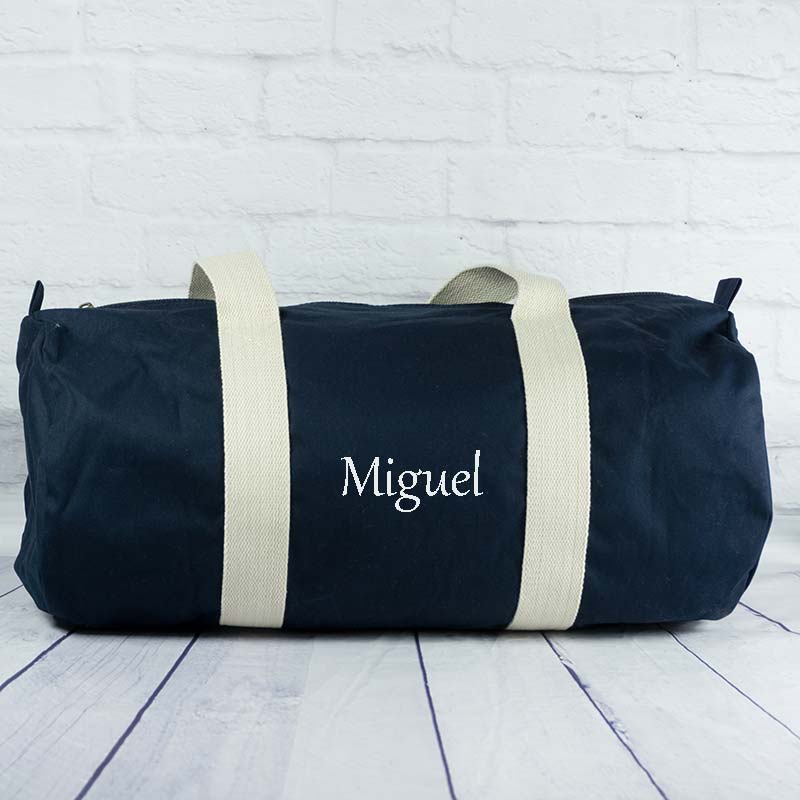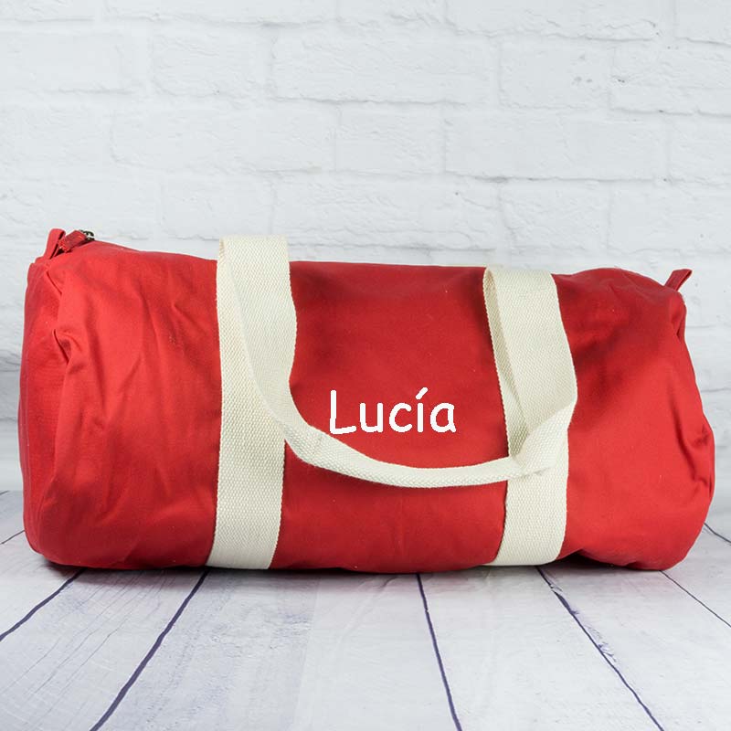 • Una bolsa de deporte tubular de algodón orgánico, personalizada con el nombre bordado.