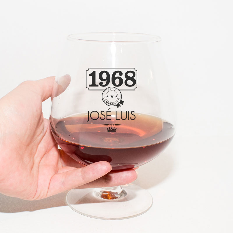 • Una Copa de Coñac personalizada con un diseño de cumpleaños único, grabada con el año de nacimiento y el nombre que tú quieras junto a un sello de Feliz cumpleaños.