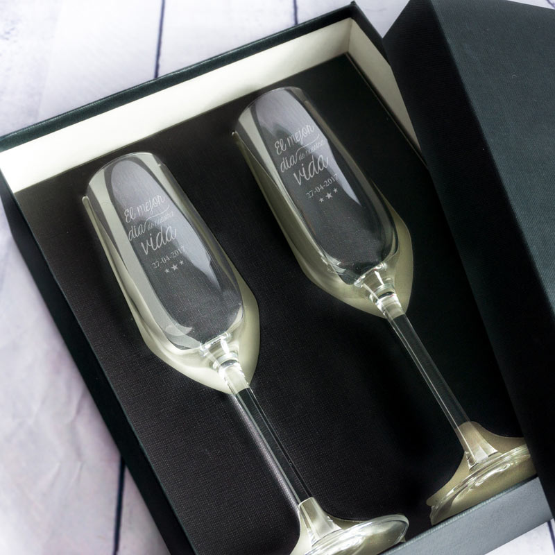 • ¿Un regalo para el brindis más especial de su vida? En Calledelregalo te presentamos un regalo precioso, dos copas de cava grabadas con la frase 'El mejor día de nuestra vida'.