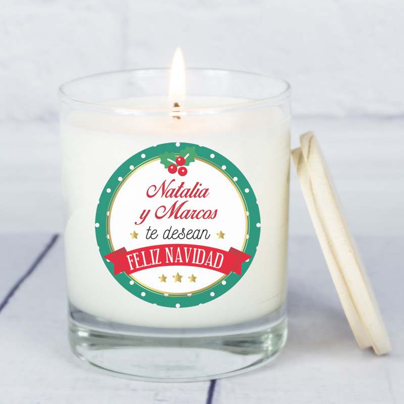 • Una vela perfumada de cera 100% vegetal personalizada con vuestros nombres junto a "Te desean Feliz Navidad" en un diseño muy navideño.